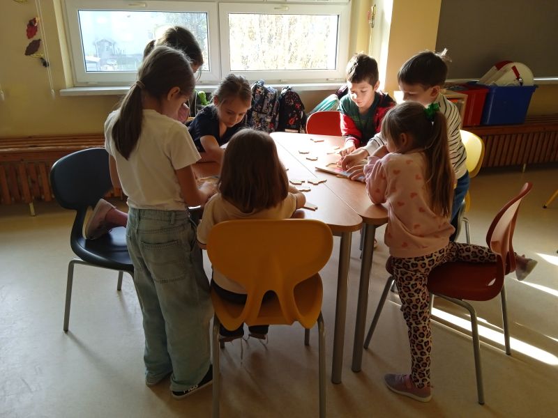 i niepodległościową. Pierwszoklasiści układali puzzle przedstawiające mapę Polski z województwami oraz oglądali zdjęcia i materiały zamieszczone na szkolnych gazetkach.