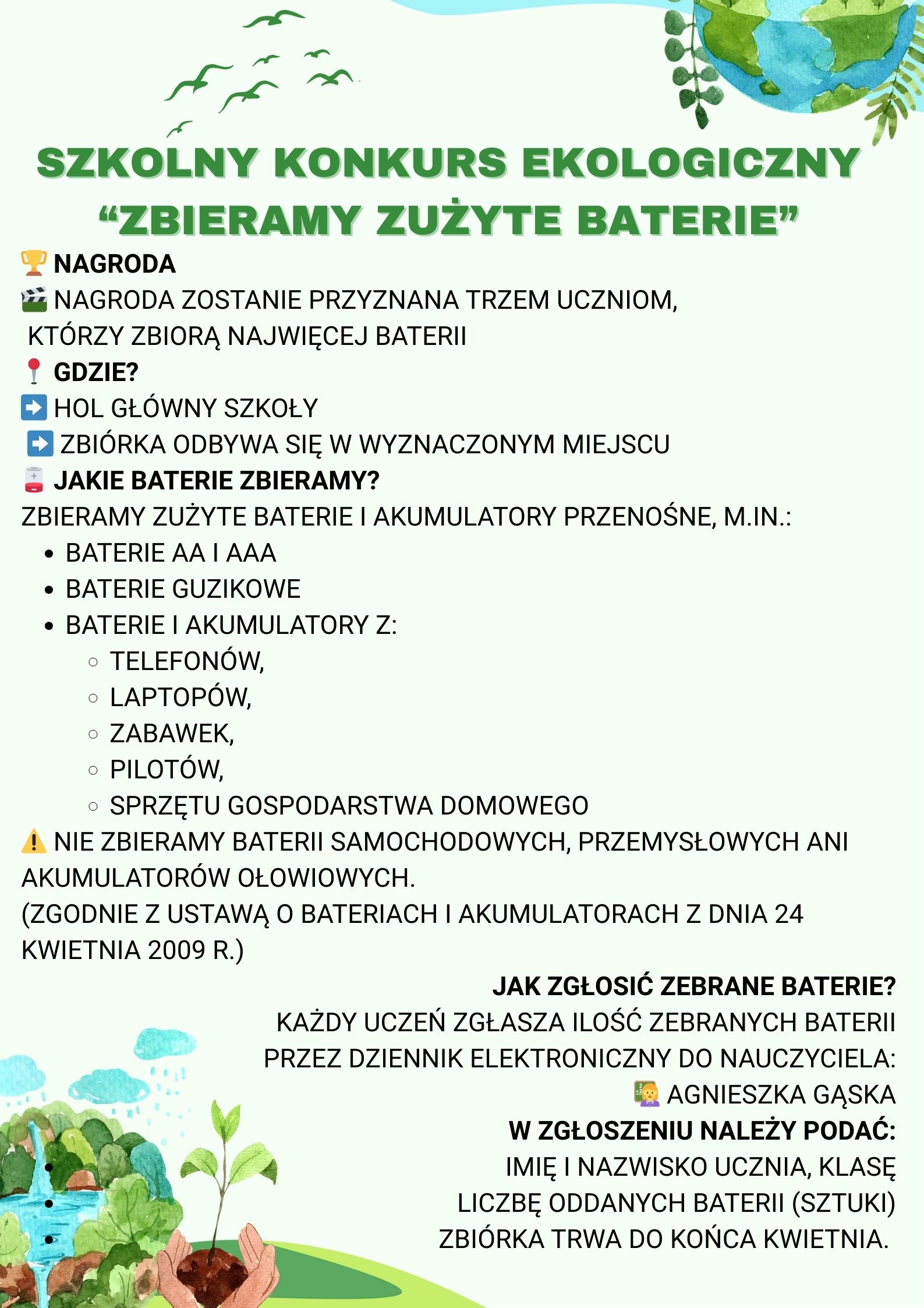 Zapraszamy wszystkich uczniów do udziału w szkolnym konkursie ekologicznym „Zbieramy zużyte baterie”. To doskonała okazja, aby zadbać o środowisko, nauczyć się odpowiedzialnej segregacji odpadów i jednocześnie… zdobyć nagrody! Zużyte baterie i małe akumulatory zawierają szkodliwe substancje, które mogą zanieczyszczać glebę i wodę. Oddając je do recyklingu, realnie chronimy przyrodę 🌱 👉 Jak wziąć udział?Zbieraj zużyte...Read More