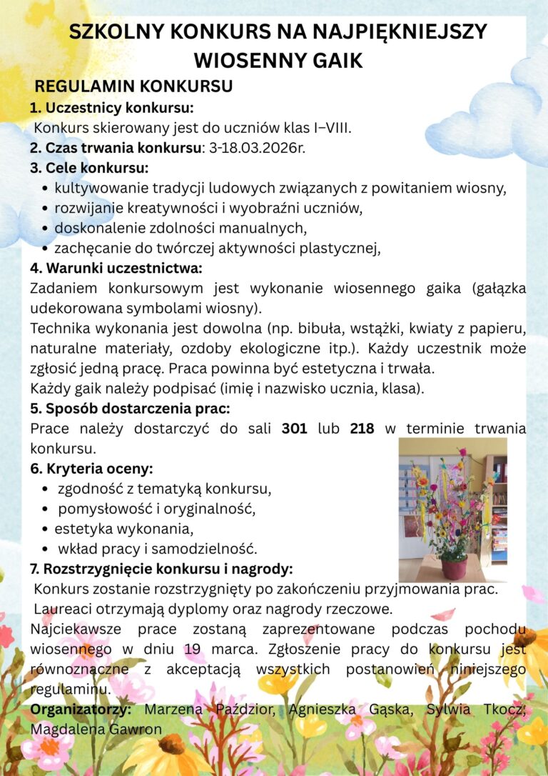 Zapraszamy wszystkich uczniów klas I–VIII do udziału w szkolnym konkursie na najpiękniejszy Wiosenny Gaik!