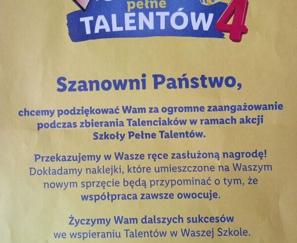 Nasza szkoła wykazała duże zaangażowanie podczas zbierania Talenciaków. Otrzymaliśmy nagrodę w postaci szafki z dziesięcioma pudełkami klocków o różnych kształtach. W sumie udało się zebrać 3241 Talenciaków. Koordynatorką akcji była pani Ewa Szewczyk. Otrzymaliśmy podziękowanie od Zespołu Lidl Polska, za które bardzo dziękujemy. Już od...Read More