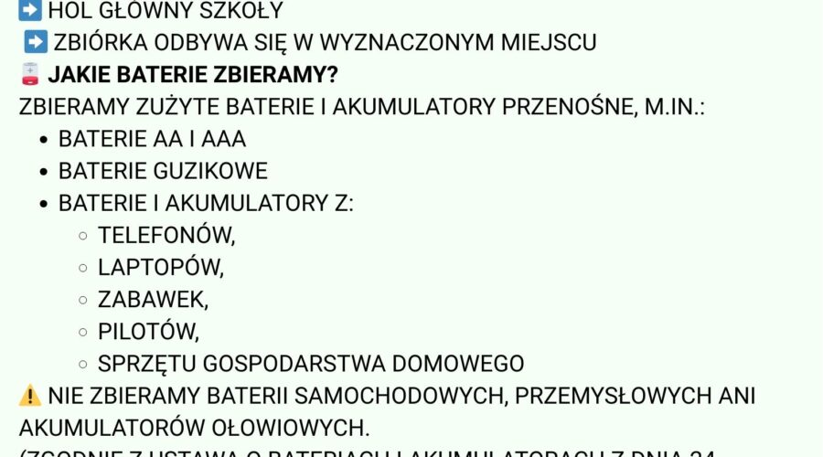 Zapraszamy wszystkich uczniów do udziału w szkolnym konkursie ekologicznym „Zbieramy zużyte baterie”. To doskonała okazja, aby zadbać o środowisko, nauczyć się odpowiedzialnej segregacji odpadów i jednocześnie… zdobyć nagrody! Zużyte baterie i małe akumulatory zawierają szkodliwe substancje, które mogą zanieczyszczać glebę i wodę. Oddając je do recyklingu, realnie chronimy przyrodę 🌱 👉 Jak wziąć udział?Zbieraj zużyte baterie w domu, przynieś je do szkoły i zgłoś ich liczbę przez dziennik elektroniczny. Trzech...Read More