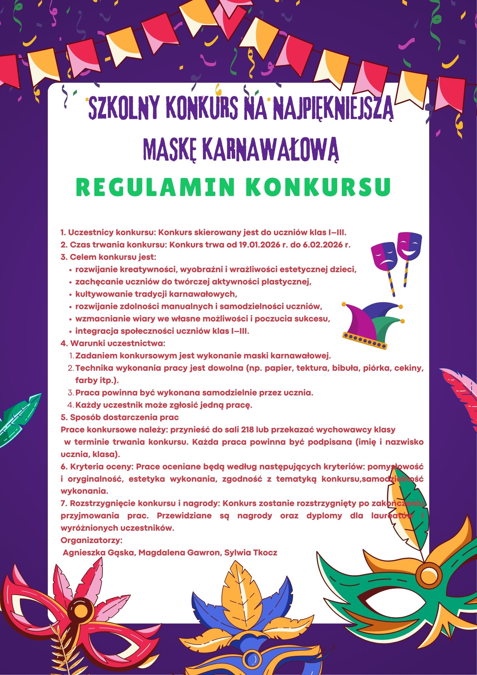 Zapraszamy uczniów klas I-III do udziału w wyjątkowym, kolorowym konkursie plastycznym! ✨To doskonała okazja, aby puścić wodze fantazji, stworzyć niepowtarzalną maskę karnawałową i zaprezentować swój talent artystyczny. 📅 Termin konkursu: 19.01.2026 r. – 6.02.2026 r.🎨 Forma pracy: dowolna technika plastyczna🏆 Na uczestników czekają: nagrody i dyplomy Konkurs rozwija kreatywność, wyobraźnię i sprawność manualną dzieci, a także...Read More