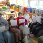 W atmosferze oczekiwania na Święta Bożego Narodzenia uczniowie klas pierwszych pisali listy po śladzie do Mikołaja, w których wyrażali prośby dotyczące prezentów. Swoje karty własnoręcznie ozdabiali kolorowymi obrazkami i śnieżynkami, zwijali w rulonik i związywali wstążką. Tak powstałe listy były przekazywane rodzicom w domu. Podczas pisania zwracano uwagę na estetykęi na to, jak zbudowany jest list....Read More