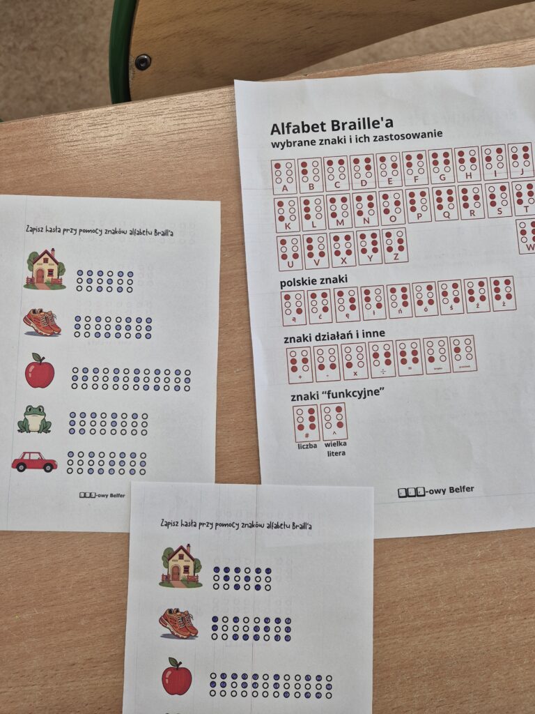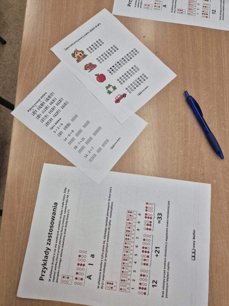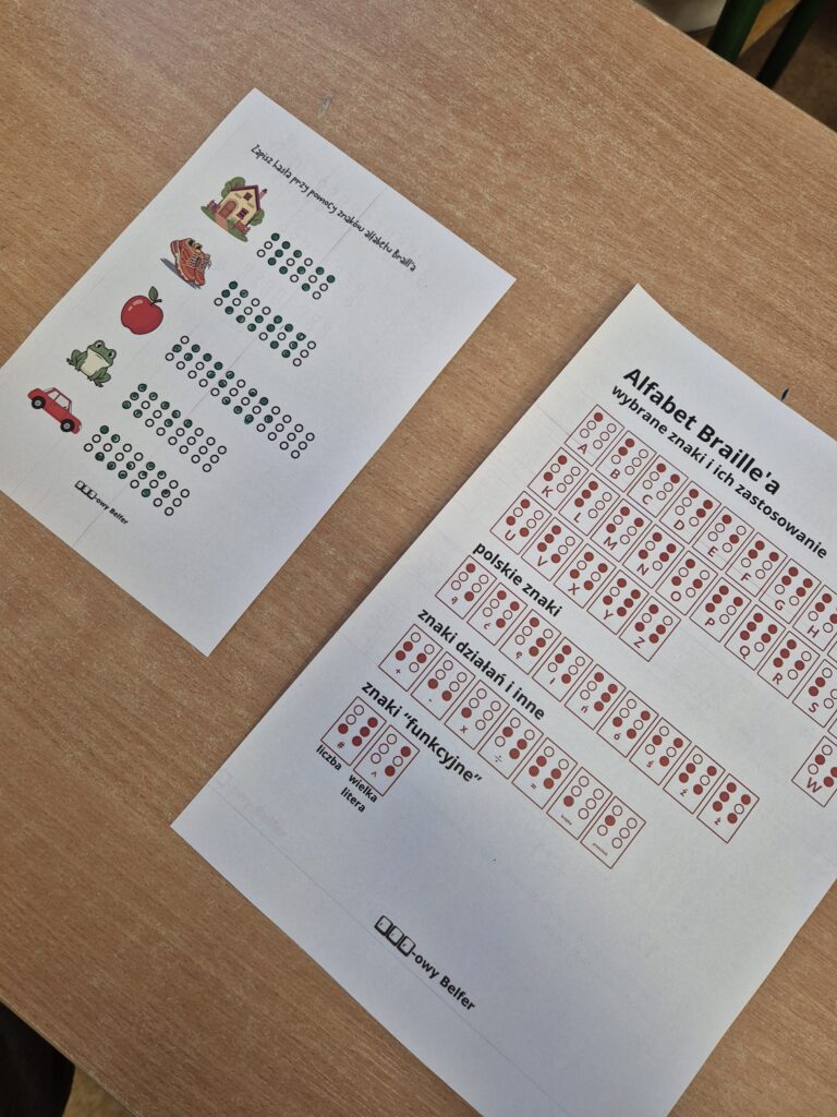 Część praktyczna lekcji polegała na odczytywaniu prostych wyrazów oraz liczb zapisanych alfabetem Braille’a przy użyciu kart pracy. Zajęcia pokazały, że matematyka i nauka mogą łączyć się z kształtowaniem postaw społecznych oraz wrażliwości na potrzeby innych.