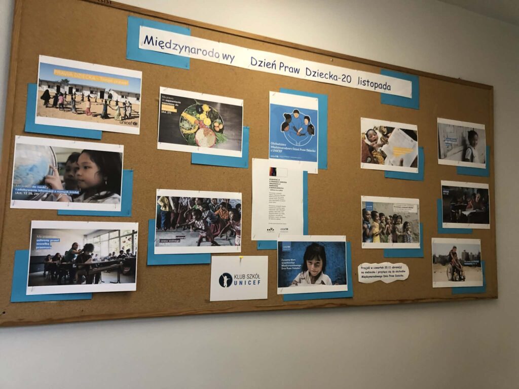 20 listopada obchodziliśmy Międzynarodowy Dzień Praw Dziecka. Uczniowie z Samorządu Uczniowskiego przygotowali wystrój szkolnego łącznika i gazetki. Przechodząc codziennie przez szkolny hol mieliśmy okazję przypomnieć sobie Prawa Dziecka zawarte w Konwencji Praw Dziecka. Zorganizowany został konkurs na najbardziej czytelną i estetyczną pocztówkę z Prawami Dziecka. Dominującym kolorem w tym dniu był niebieski, który jest symbolem Unicefu – organizacji działającej na rzecz dzieci na całym świecie. Przez szkolny radiowęzeł została nadana audycja o Prawach Dziecka.