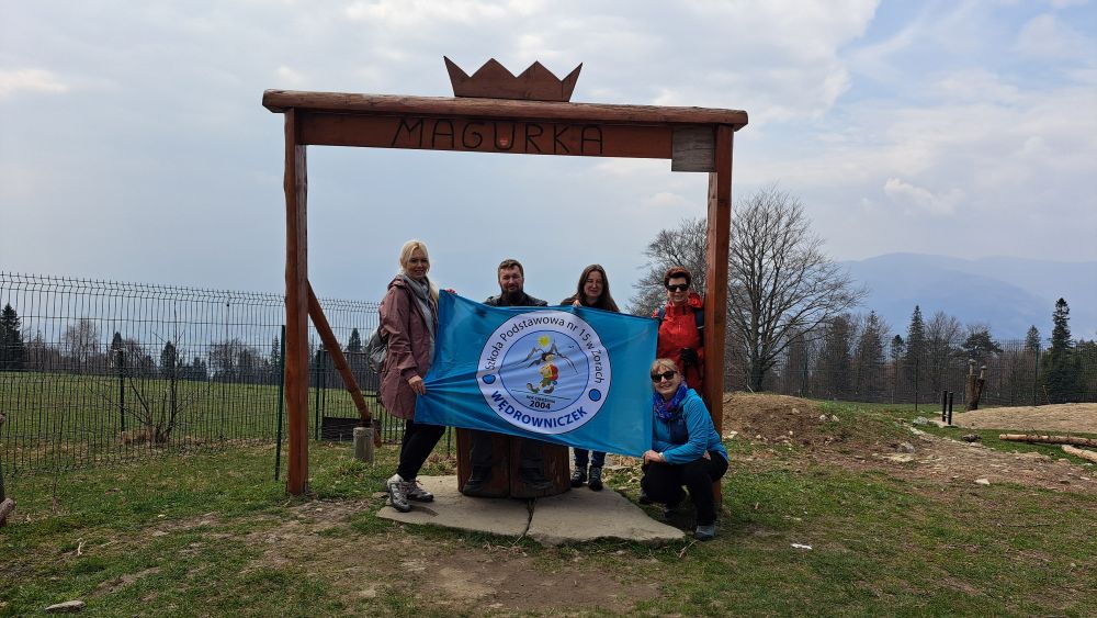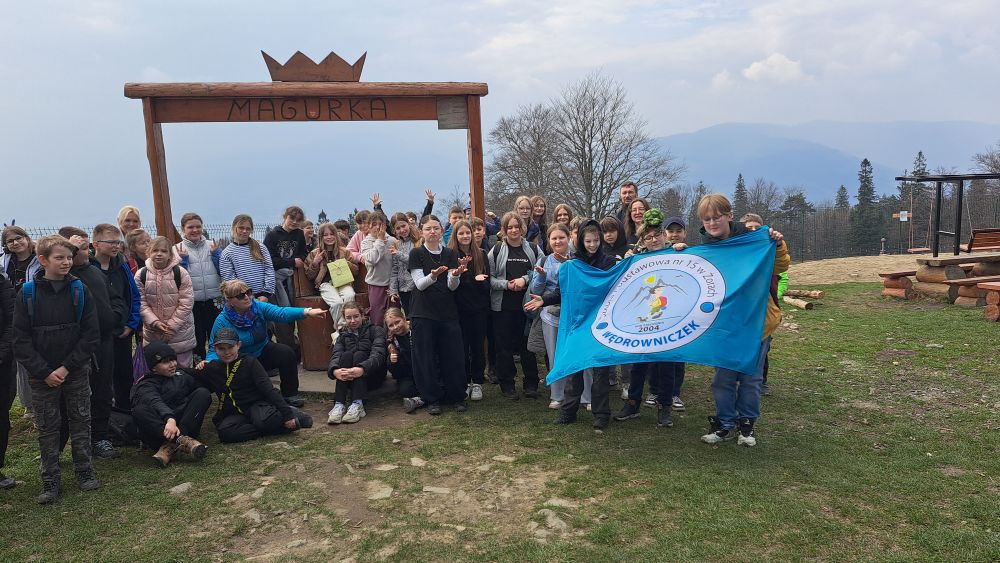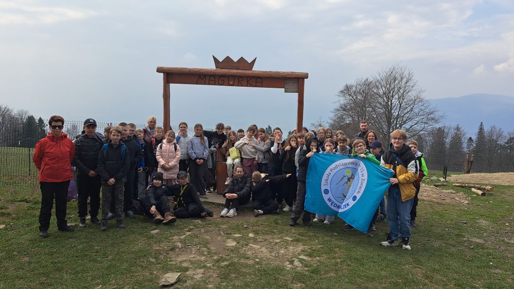 Szkolne Koło Turystyczne „Wędrowniczek” 16 kwietnia wyruszyło na wiosenną wyprawę. Tym razem uczestnikami byli uczniowie klas czwartych i piątych naszej szkoły – 47 uczniów. Celem wyprawy było pasmo Beskidu Małego ze zdobyciem szczytu Magurki Wilkowickiej. Wybraliśmy szlak Czerwony z Bielska Białej – Stalownika przez Rogacz na Magurkę, a następnie niebieskim szlakiem zeszliśmy do Przełęczy Przegibek. Uczestnicy z dużym zaangażowaniem pokonywali trasę, podziwiając piękno górskiej przyrody, wsłuchując się w śpiew ptaków oraz ucząc się bezpiecznego poruszania po szlakach. Wędrówka przebiegła w miłej koleżeńskiej atmosferze, sprzyjając integracji uczniów. Po dotarciu na szczyt był czas na dłuższy odpoczynek w Chacie na Magurce i w Schronisku oraz okazja do odśpiewania „Sto lat” solenizantce Wiktorii, której dziękujemy za słodki poczęstunek![]()