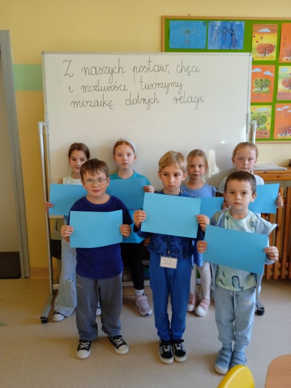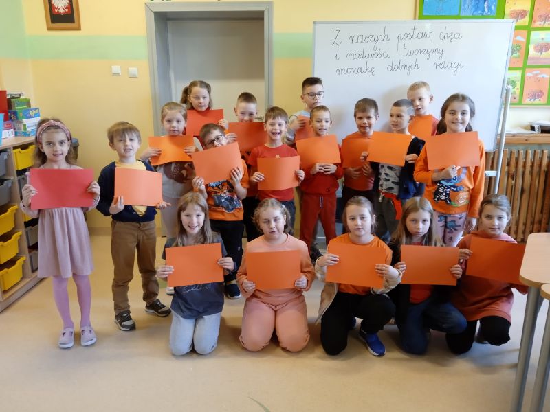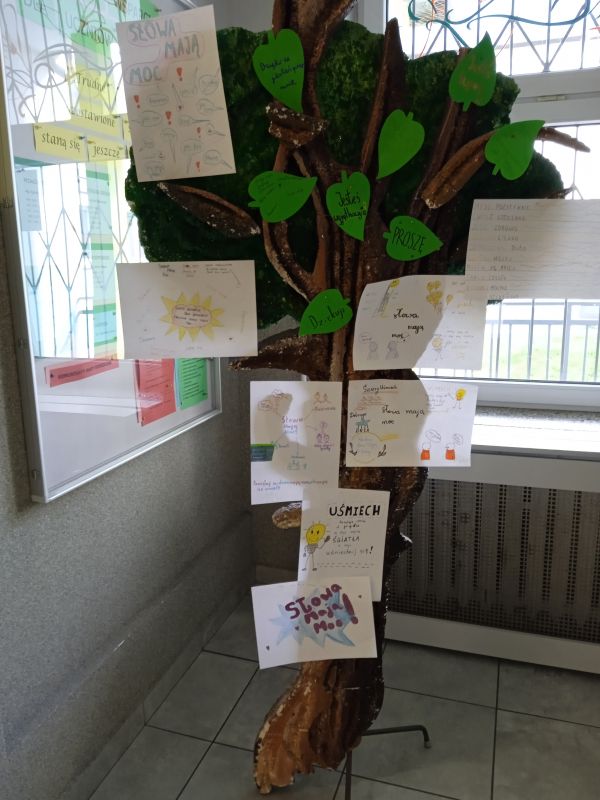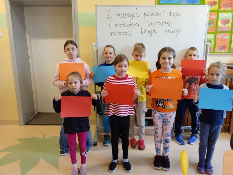 W dniach od 20-25 października odbył się w naszej szkole Tydzień budowania dobrych relacji. Uczniowie z klas młodszych ubrani w kolorowe koszulki i trzymając w dłoniach kartki stworzyli barwną mozaikę dobrych relacji. Zobaczyliśmy filmy, które prezentowały relacje międzyludzkie powstałe w różnych sytuacjach. Starsi zaś umieścili dobre słowa na drzewach, które stanęły na korytarzu i w świetlicy szkolnej. Tydzień był pełen pozytywnych wrażeń i zakończył się swobodnymi rozgrywkami w gry planszowe.