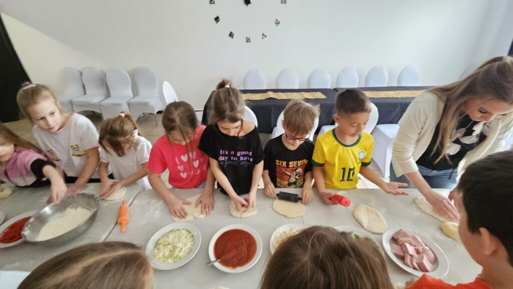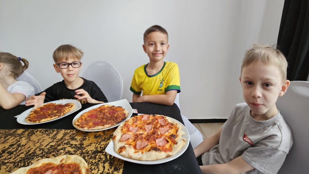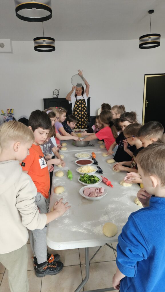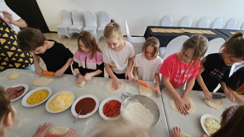 16 marca uczniowie klasy 1b uczestniczyli w warsztatach kulinarnych w pizzerii „Gastrofaza”. Dzieci miały okazję samodzielnie komponować swoje pizze, wybierając ulubione składniki i dekorując je według własnego pomysłu. Zajęcia rozwijały zmysł smaku, estetykę potraw oraz umiejętność współpracy w grupie. Uczniowie mogli radośnie doświadczać gotowania, łącząc naukę z zabawą i integracją zespołu klasowego.