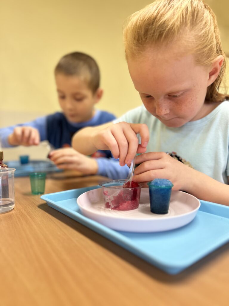 Podczas zajęć dzieci uczestniczyły w interaktywnym eksperymencie pokazowym, który łączył elementy pokazu z częścią praktyczną. Uczniowie nie tylko obserwowali doświadczenia, ale również samodzielnie wykonywali eksperymenty przy stanowiskach Małego Naukowca.