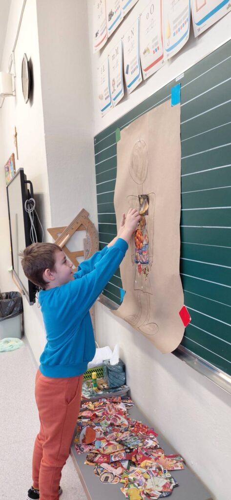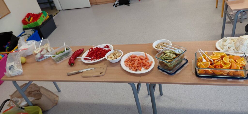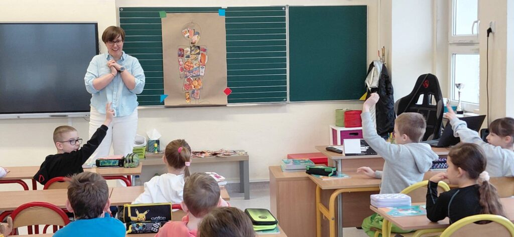 Na początku uczniowie wykonali ciekawe zadanie plastyczne, polegające na naklejeniu na kontur dziecka obrazków produktów spożywczych, które najczęściej jedzą. Prowadząca omówiła tę pracę i zwróciła uwagę na szczególną wartość zdrowotną warzyw i owoców. Wyjaśniła ich wpływ na funkcjonowanie organizmu. Następnie wyróżniła te z nich, które dostarczają najwięcej witamin A i C. Po prezentacji dzieci zostały zaproszone do „szwedzkiego” stołu, gdzie mogły spróbować różnych surowych warzyw i owoców. Z entuzjazmem wypowiadały się na temat walorów smakowych białej kapusty, kalafiora, papryki i kiełków. Dowiedziały się też, że wchłanianiu witaminy A sprzyjają tłuszcze, np. z orzechów nerkowca. Na zakończenie zajęć dzieci dostały karty z listą warzyw i owoców oraz zostały zachęcone do spróbowania ich w domu. Prowadząca odpowiedziała też na pytania dzieci. Warsztaty były bardzo ciekawe, dostosowane do wieku dzieci i przeprowadzone w przyjaznej atmosferze. Dzieci doceniły wartość porad przekazanych przez specjalistkę.